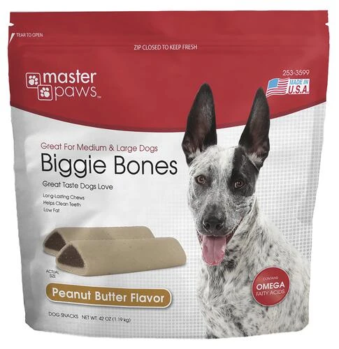 Master Paws Biggie Bones offers your dog a yummy peanut butter flavor treat made in the USA. Low fat, long-lasting and rawhide-free! These tasty treats contain Omega Fatty Acids which help promote healthy skin and shiny coat.