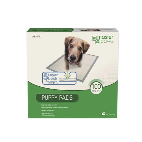Master Paws Puppy Pads feature a 5-Layer Lock system for great liquid and odor absorption. Leak-proof backing helps catch liquid and avoid leaks. Adhesive peel and stick tabs help keep pads securely in place. Pads measure 22″ x 22″.
